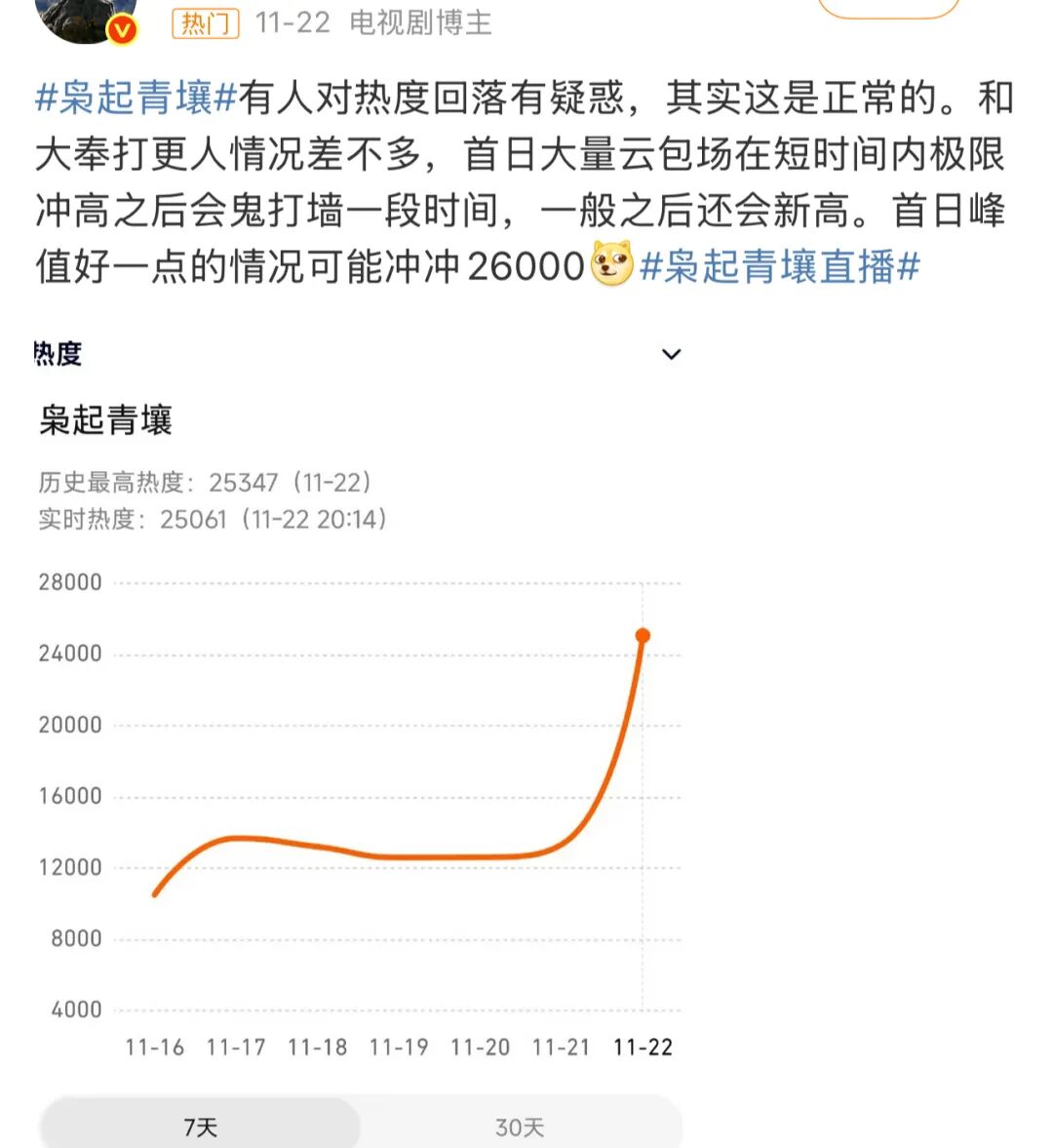 开播初期的热度过后,剧集在黄金时段出现了非常规的负增长,工作日白天时段的热度也持续回落,一度跌破20000的基准线,引发了关于剧集真实热度的讨论。