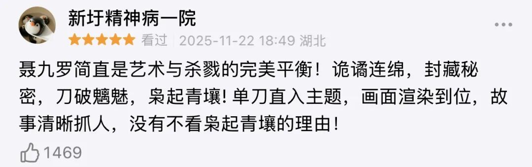 一边是直接“封神”的盛赞,有人直接把聂九罗夸成“艺术与杀戮的完美平衡”,剧情“诡谲连绵、单刀直入,没有不看的理由”;纯路人也狠狠共情,说是继《司藤》后尾鱼IP改编的又一佳作,前四集“娓娓道来,镜头感能带来心跳刺激”。