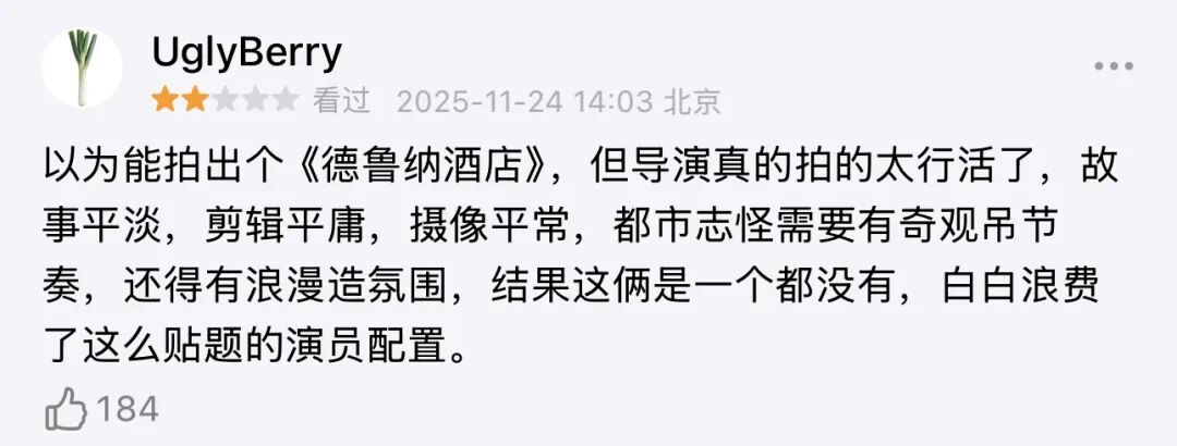 还有人吐槽导演拍得“太行活”,剪辑摄像全都平平无奇,都市志怪该有的奇观和浪漫氛围全没有,白白浪费了贴脸的演员,落得个“女美男帅,剧情让位”的评价。