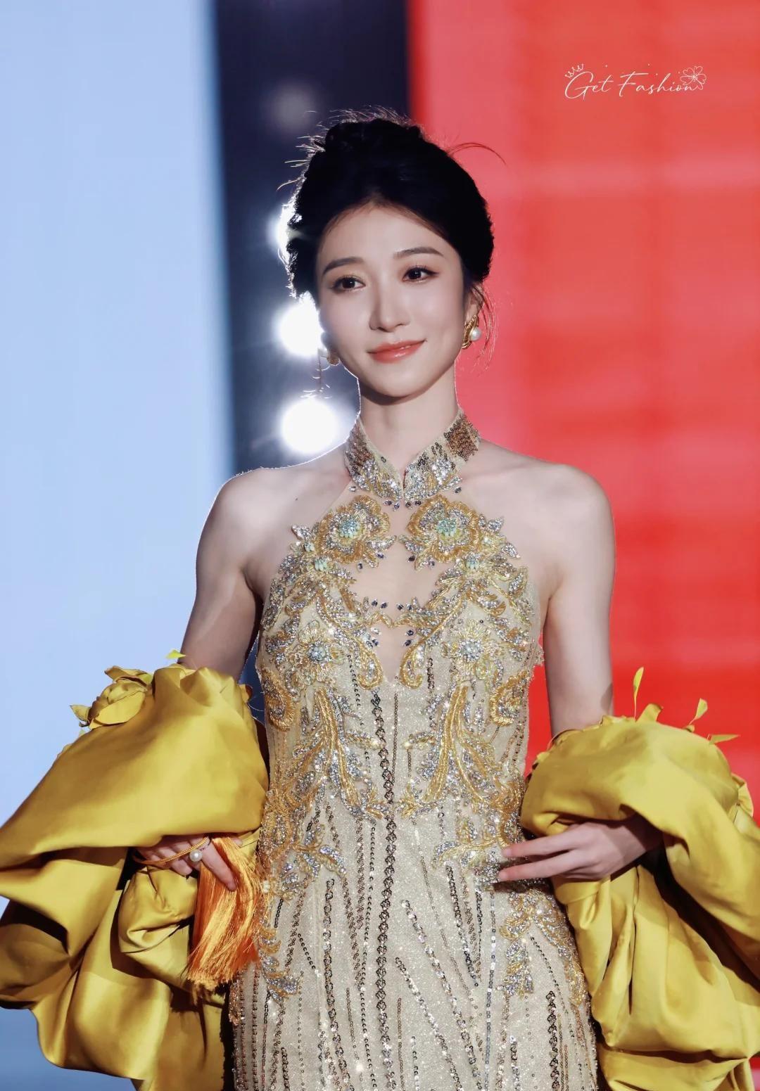王格格选择金色挂脖礼服,首饰搭配精致,仪态端庄稳重,被形容为“红毯定海神针”。但近距离拍摄显示皮肤质感一般,粉底浮于表面,妆面不够服帖。