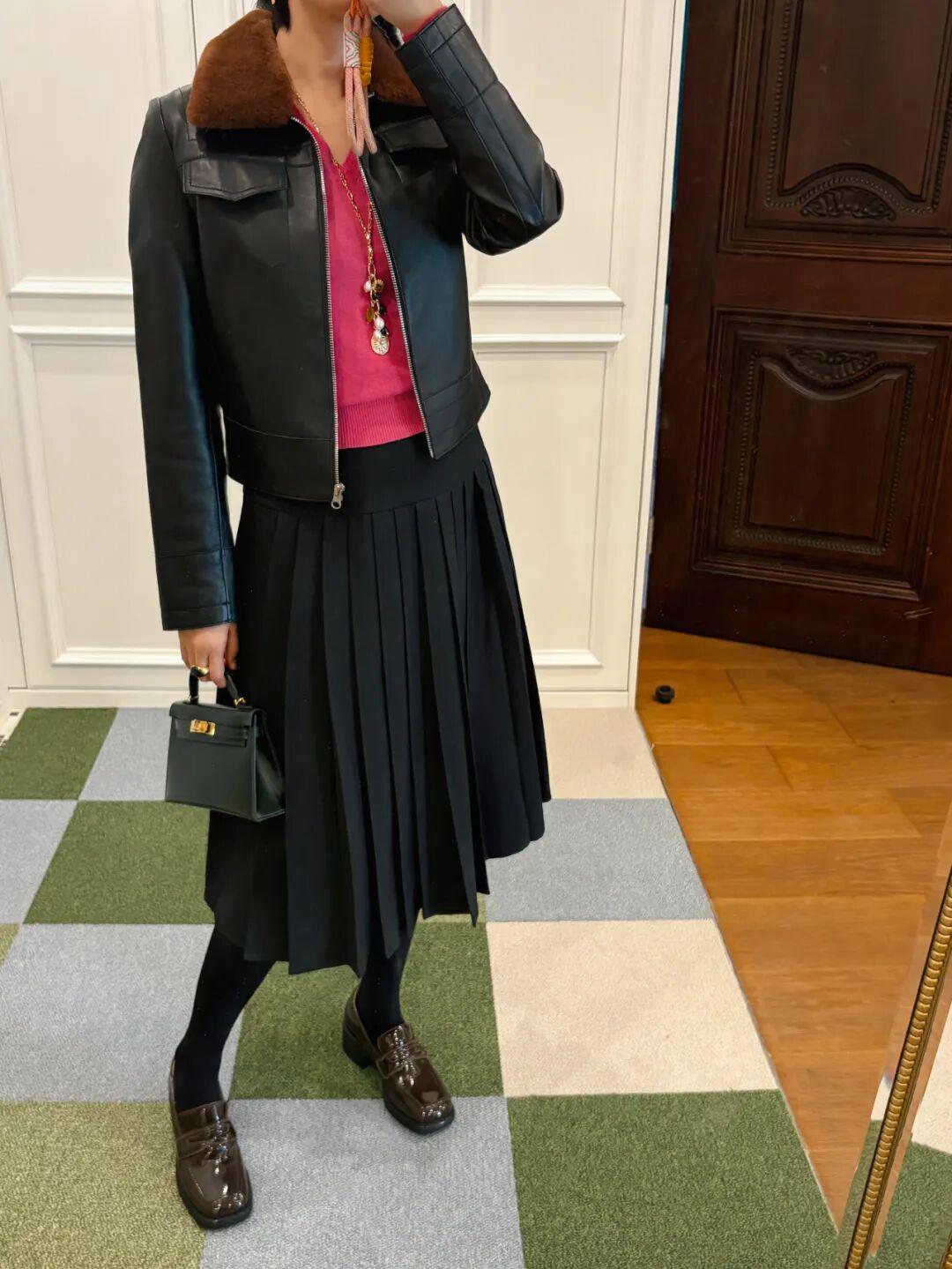 她会利用同色搭配法则,比如这条红色半裙的颜色就呼应了外套上的红色细节,整体穿搭更和谐。▼