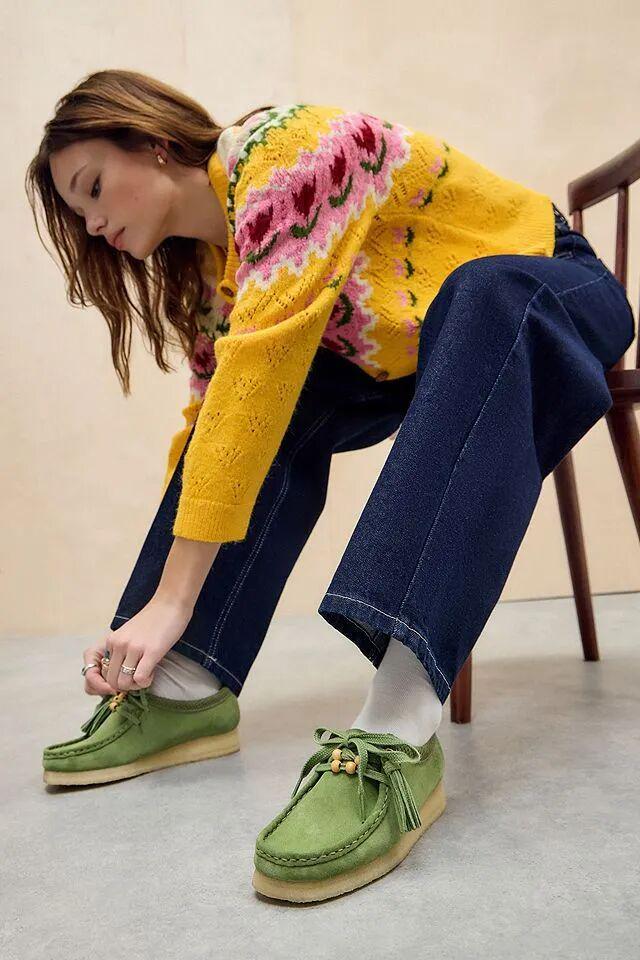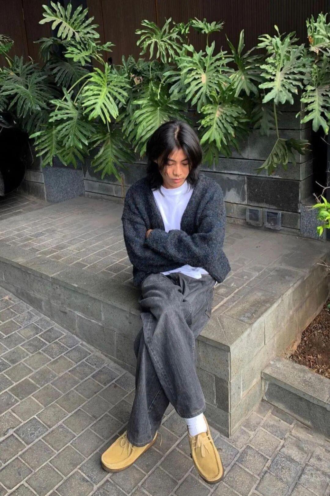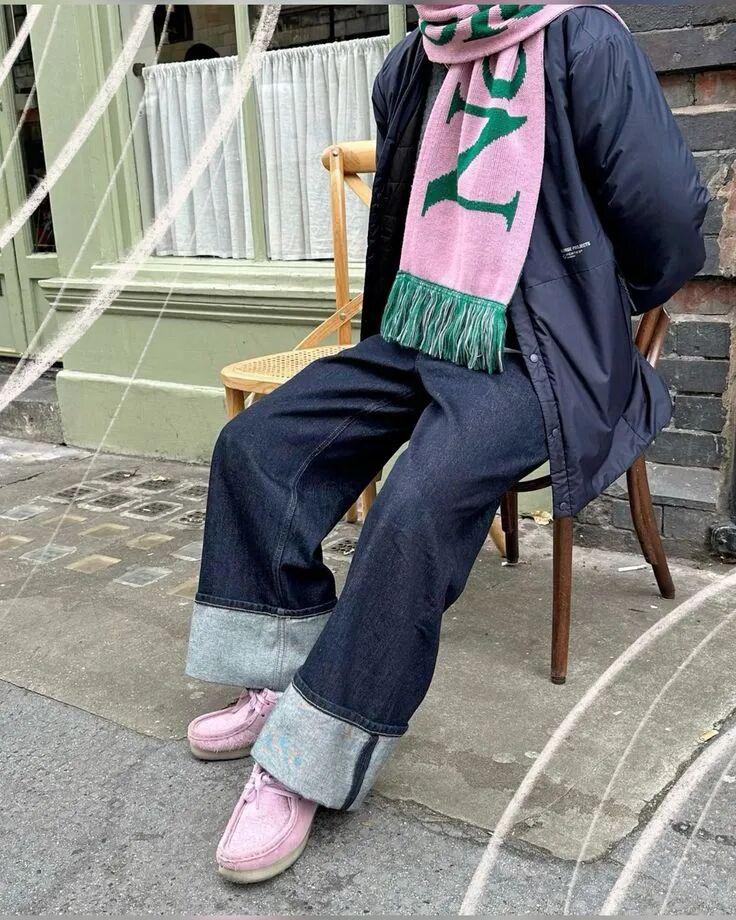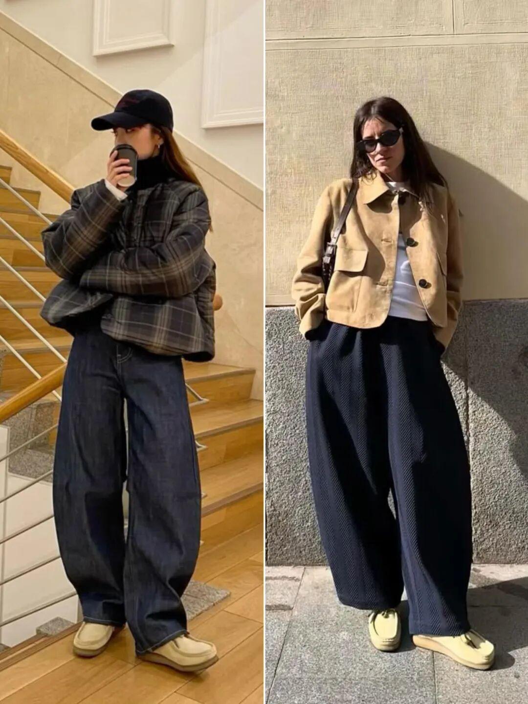 袋鼠鞋和今年超火的弯刀裤也很适配,不过弯刀裤更适合高个子,小个子如果想尝试这个搭配可以穿短款外套来优化比例。▼