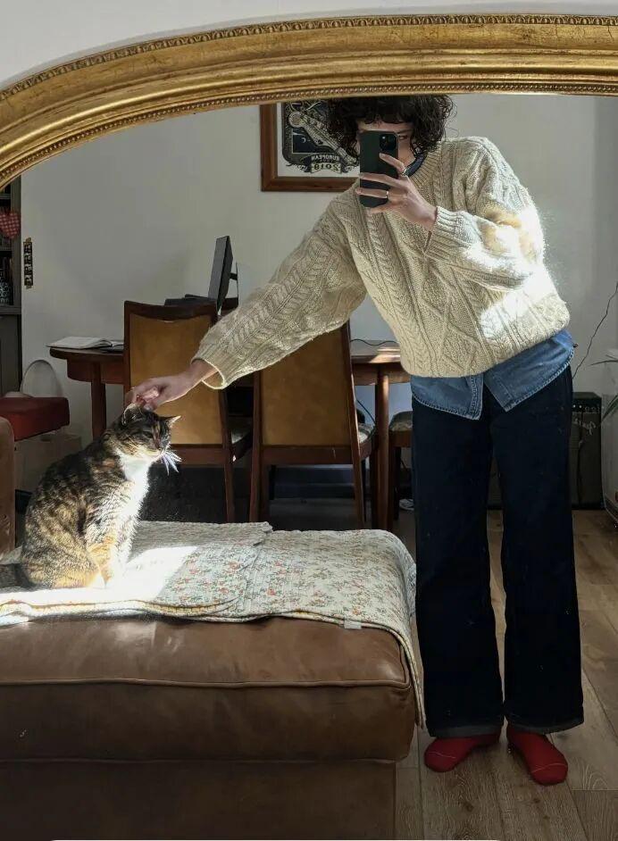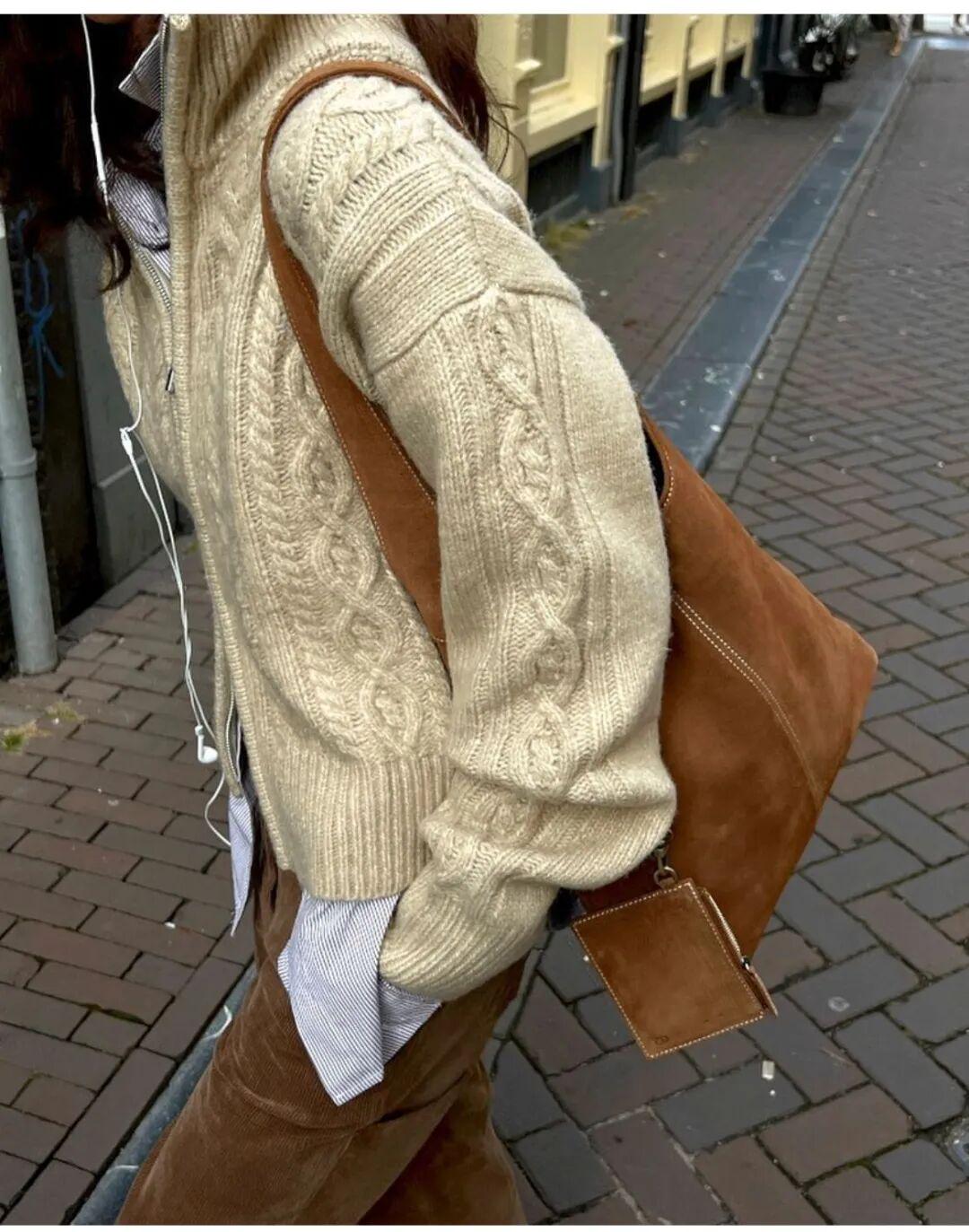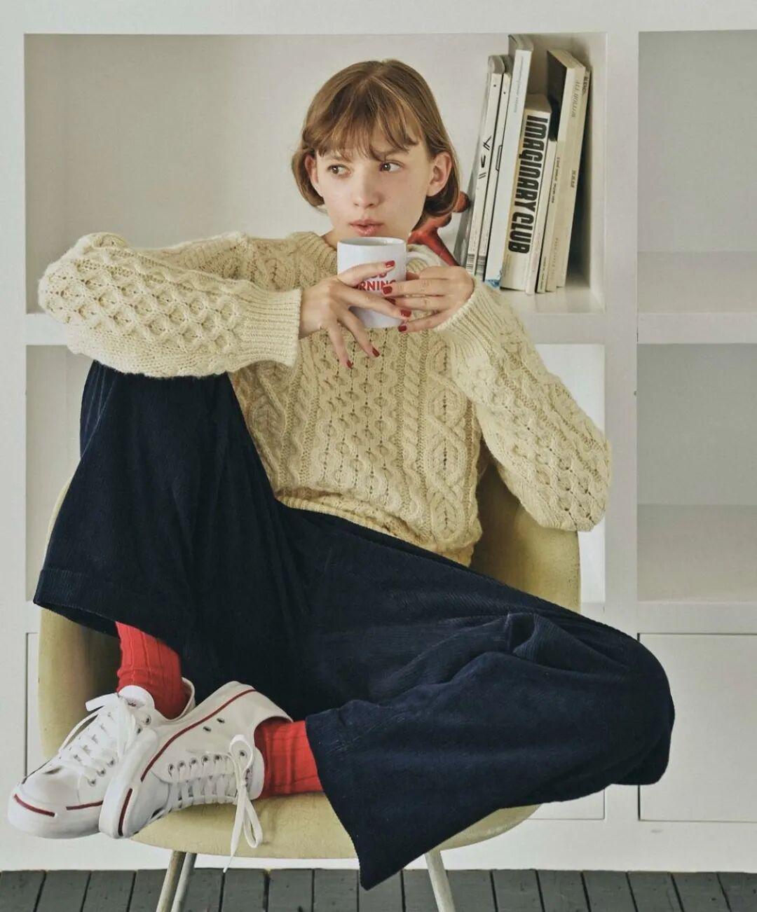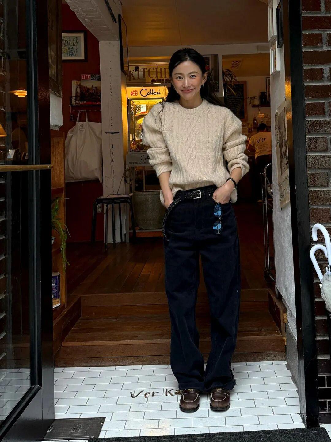 灯芯绒材质同样是绞花毛衣的好伙伴,一起搭配是复古温暖的冬日氛围感。▼