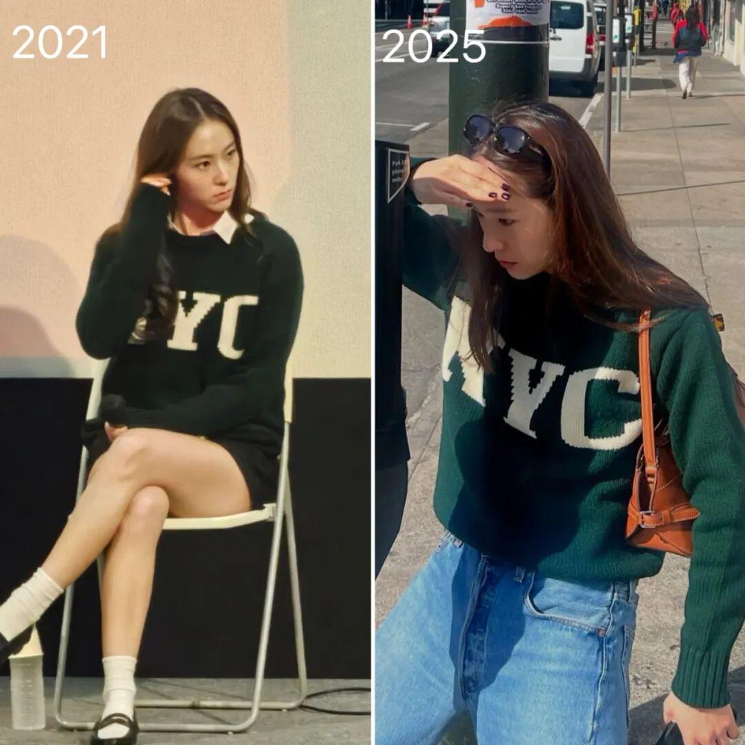 这件棒球外套她从2019年开始穿,到2024年的街拍还有露出,可以看出她真的特别喜欢了。▼