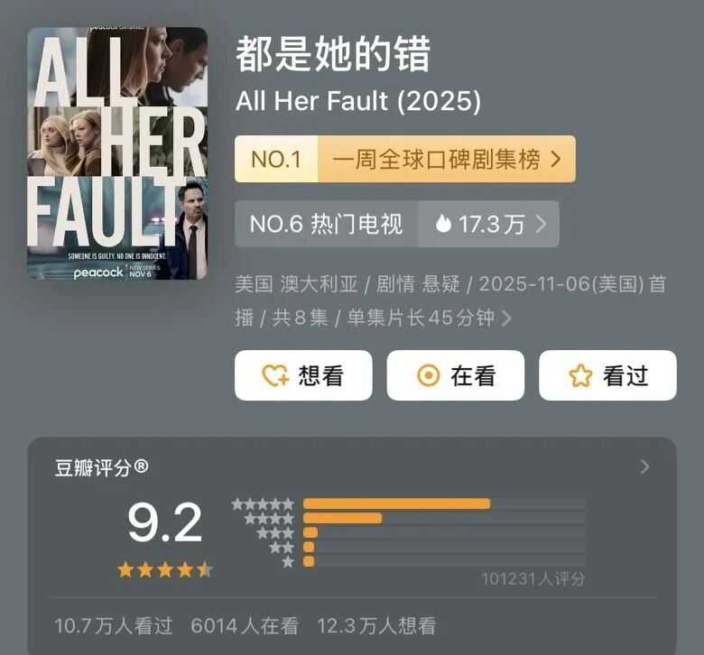 但以目前9.2的高评分而言,这两种对立评价,并未在本剧的国内口碑上形成强力对冲,这部剧依旧以出色、新鲜的悬念设置、人物塑造等,收获了近期最佳、最热的评价。