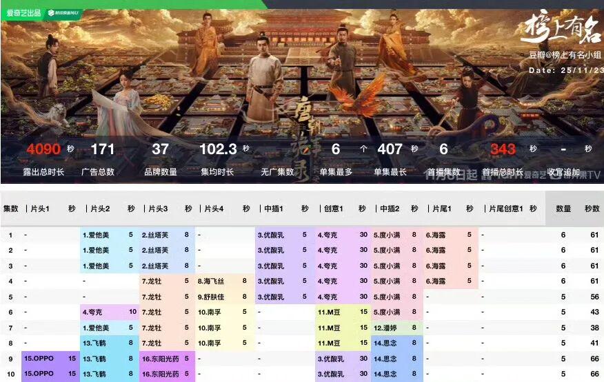 其中,《唐朝诡事录之长安》作为系列的第三部,在无流量明星加持的情况下,创下爱奇艺年度招商纪录。总体容量上,全剧视频广告总时长突破4090秒,居平台首位;品牌覆盖上,吸引康师傅、茅台、度小满等超30家品牌合作,横跨食品、金融、奢侈品等多个领域;内容形式上,单集最高广告时长达到407秒,并通过品牌定制精品广告剧,完成从硬植入到内容共创的转换。