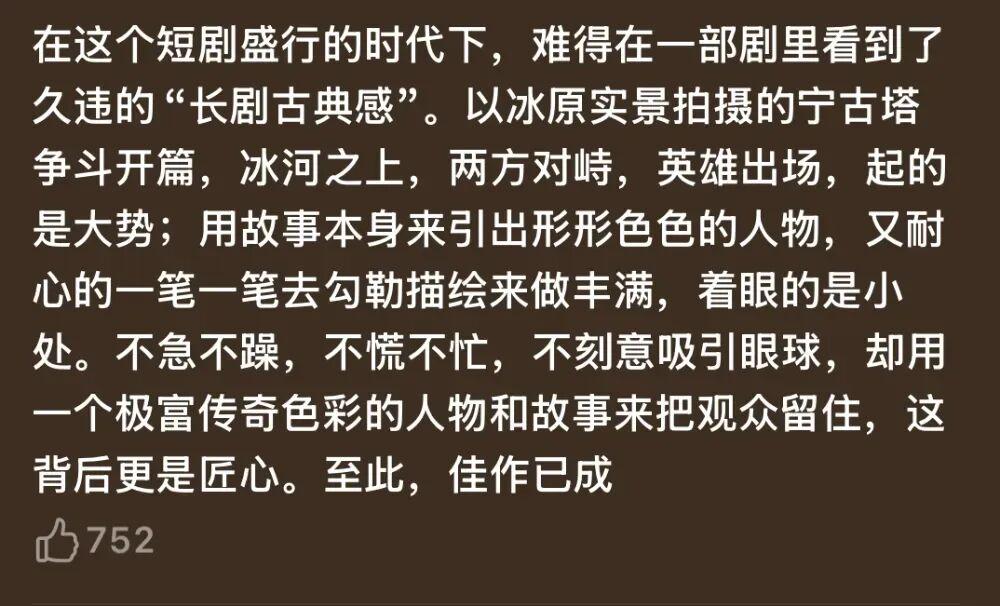 社交平台上,“真有剧拍出流放宁古塔”登上热搜。也有网友评价道:“在这个短剧盛行的时代下,难得在一部剧里看到了久违的‘长剧古典感’。”