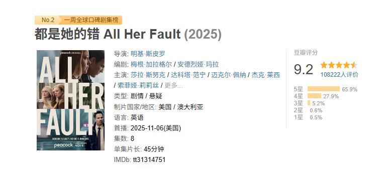 1. 哈喽,大家好,小玖最近被一部悬疑剧彻底俘获,豆瓣高达9.2分的《都是她的错》。