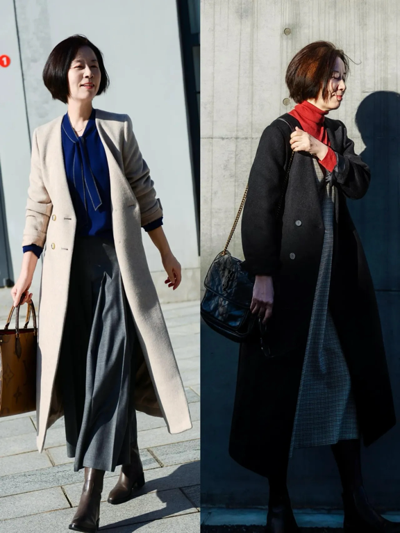 如果穿裙子,版型则首选A字裙、茶歇裙,长度控制在膝盖上下3厘米,既优雅得体,又能修饰腿部线条,走路自带轻盈感。