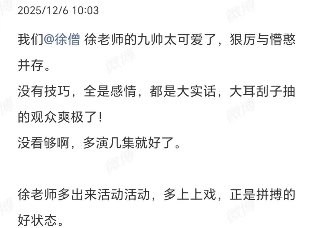 这次,徐僧在《大生意人》中饰演九帅时,动作戏与神态戏均十分传神。徐僧凭借习武底子,掌掴保庆、乔松等戏份时,气场霸道、眼神凌厉、动作利落,将武将的杀伐果决演绎得淋漓尽致,观众称其刚硬气场焊在身上,掌掴同僚的劲儿直接圈粉,以至于呼吁九帅戏份加码,徐僧值得更多的剧。