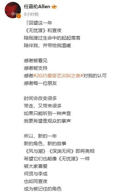 12月6晚深夜,演员任嘉伦在2025年爱奇艺尖叫之夜荣获观众瞩目演员之后,在个人社交平台发文透露,新剧即将亮相。“新的一年,新的角色,新的故事,《风与潮》《深渊无间》即将亮相,希望它们也能像《无忧渡》一样,被大家喜爱,何贤与李成,也如同宣夜,成为被记住的角色。”