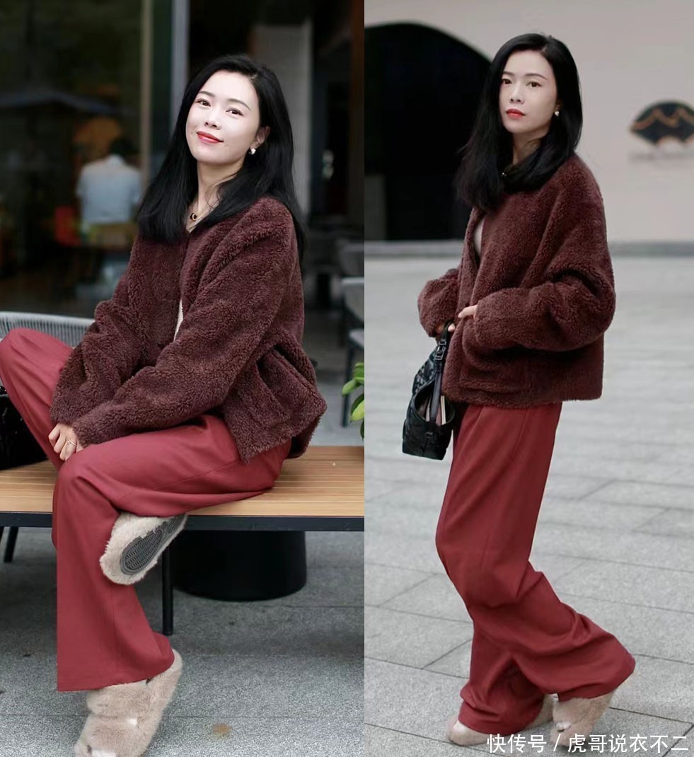 想要在穿搭中构造出比较适宜的腰线位置,那么就不能忽略上装衣摆的长度,因此可以直接借鉴上图这位博主的穿法,运用红棕色短外套与红色阔腿裤匹配,配色上做到了流畅的叠加与延续感,也在视觉上形成了“上短下长”的感觉。
