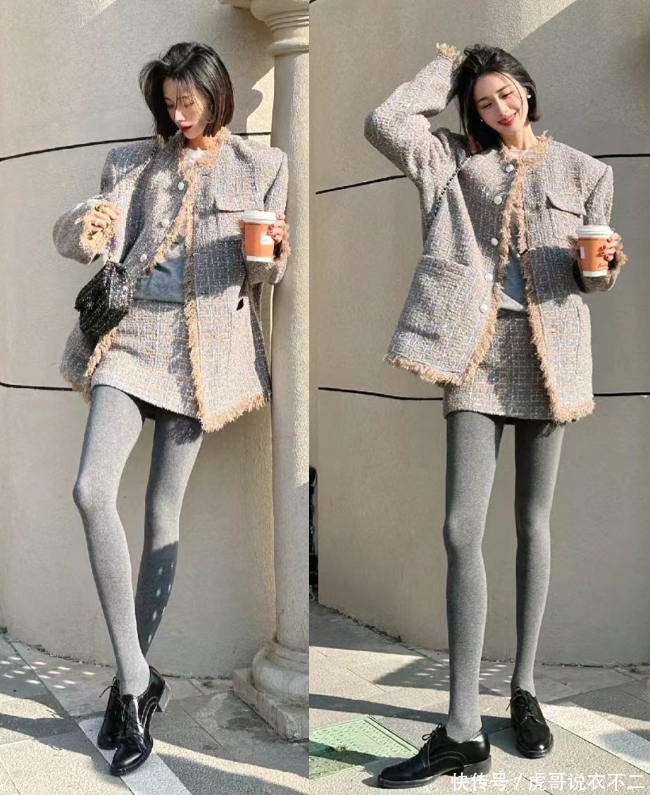 上图这位博主就采用了一身小香风套装,短裙与打底裤的结合又保暖又显腿长,同时还能与外套宽大的版型形成对照,展现出慵懒精致的感觉。