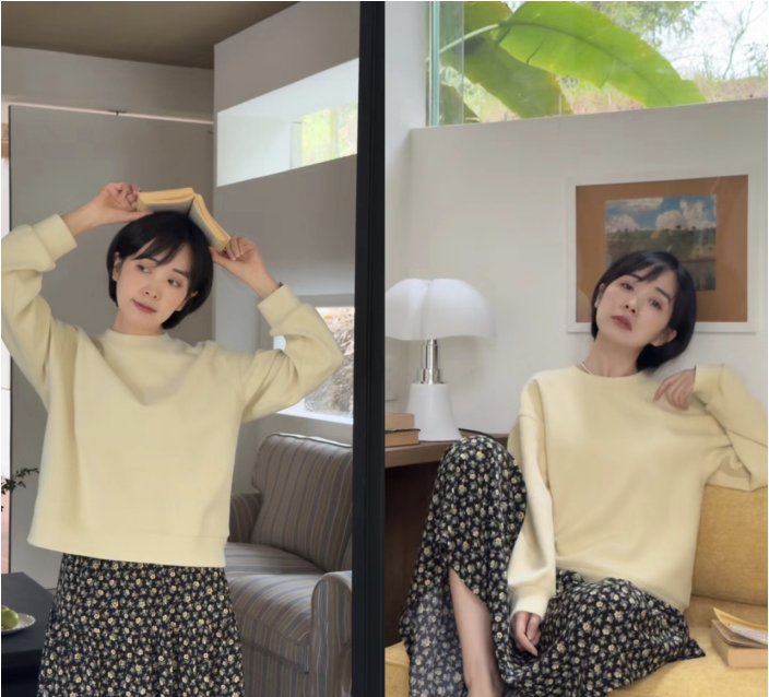 像这两款毛衣开衫,它们的质地是比较厚实的,相对来说会比薄一点的单品更保暖,在下半身可以组合稍微宽松的基础色长裤,方便对腿型进行简单的拉长,而且保证单品之间的颜色不会互相冲突。