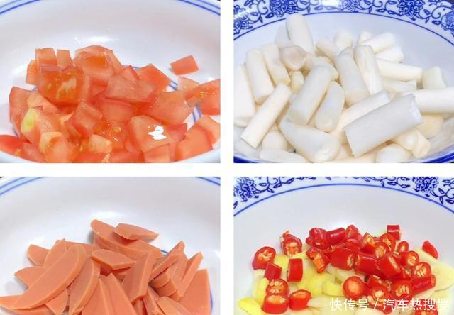 2、准备配料,半个西红柿切成小块,一把白玉菇切成小段,一根火腿肠切成薄片,生姜、大蒜、小米辣全部切碎,放入碗中。