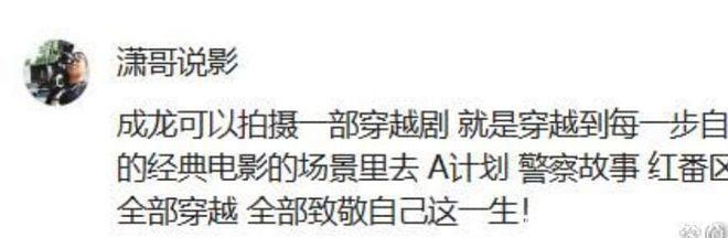 成龙可以拍摄一部穿越剧 就是穿越到每一部自己拍摄的经典电影的场景里去 A计划 警察故事 红番区 我是谁 全部穿越 全部致敬自己这一生!