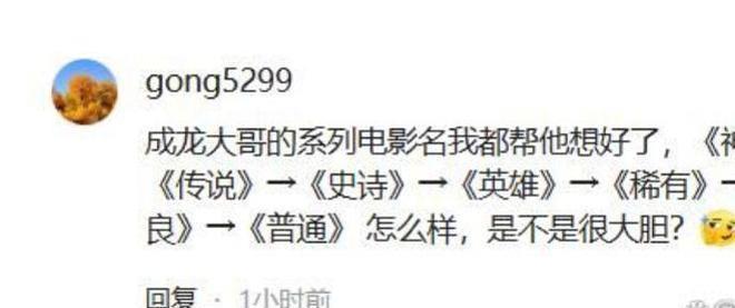 成龙大哥的系列电影名我都帮他想好了,《神话》→《传说》→《史诗》→《英雄》→《稀有》→《精良》→《普通》 怎么样,是不是很大胆?