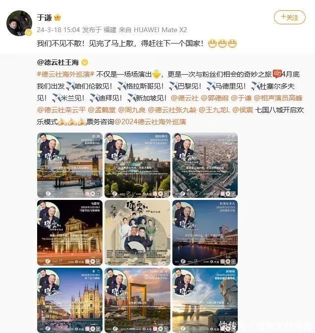 谦哥不仅拍电影,过段时间他还要出国演出,郭德纲和于谦率领德云社的演员们出国巡演,谦哥发文称,我们不见不散!见完了马上散,得赶往下一个国家!