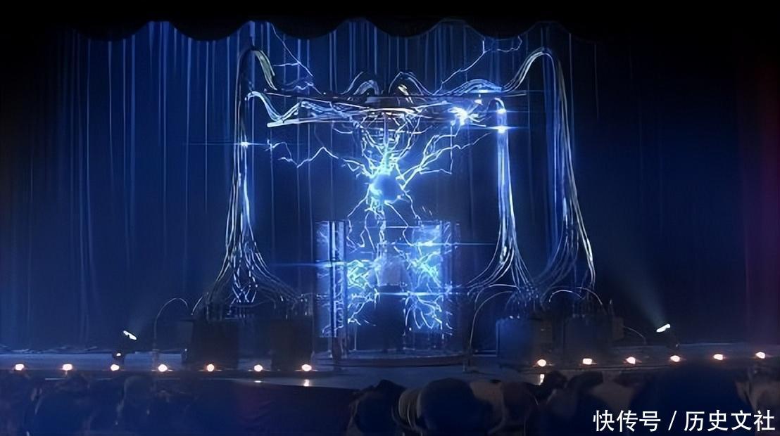 影片《致命魔术》中 1 分 49 秒左右,安吉尔一开始的登台演出,他置身于特斯拉的交流电之中,整个人沐浴在雷光之中宛若雷神。不仅场下观众惊叹连连,荧幕外的观看者也揪心不已,实际上这就是诺兰制作的特效效果,将交流电的视频与安吉尔表演的视频通过电脑技术合二为一,营造了一种大魔术奇观场景。