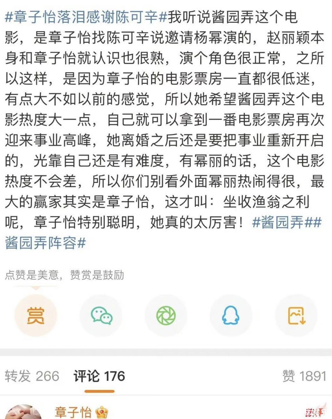 之后便有人在网上发文评价章子怡,说杨幂出演电影是由章子怡牵线,而赵丽颖本身就与章子怡很熟,演个角色很正常,该网友指出,章子怡近两年的电影票房一直很低迷,大不如前,所以她希望《酱园弄》这个电影可以热度大一些,好助她重回事业巅峰,网友说有杨幂跟赵丽颖在,电影就不缺热度,别看外面两家粉丝闹得厉害,可到最后章子怡依旧是大赢家,这就是“坐收渔翁之利” 不料章子怡本人看到了这条微博,然后在评论区怒怼这位网友,直言闭嘴白痴。