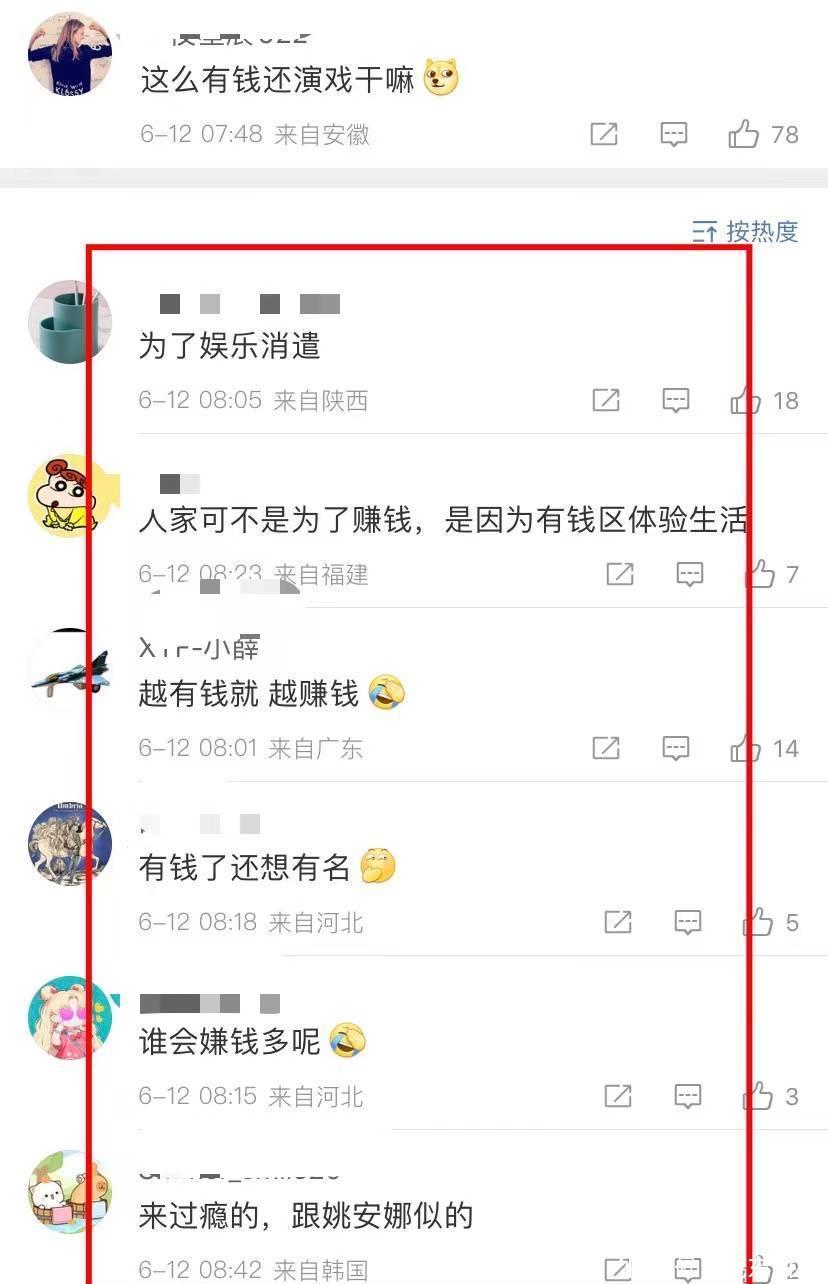 网友纷纷评论何超莲为什么要跨界演戏,认为她目的是过瘾,像姚安娜一样。还有人认为越有钱的人越想赚钱和出名。也有人认为她可能是消遣娱乐,还有的说是为了体验生活。但何超莲可能也不想成为名演员,要当演员可能早就当了,可能纯属过把瘾,当然也想体验拍戏,和老公感同身受,有利于双方更加了解和互相支持。