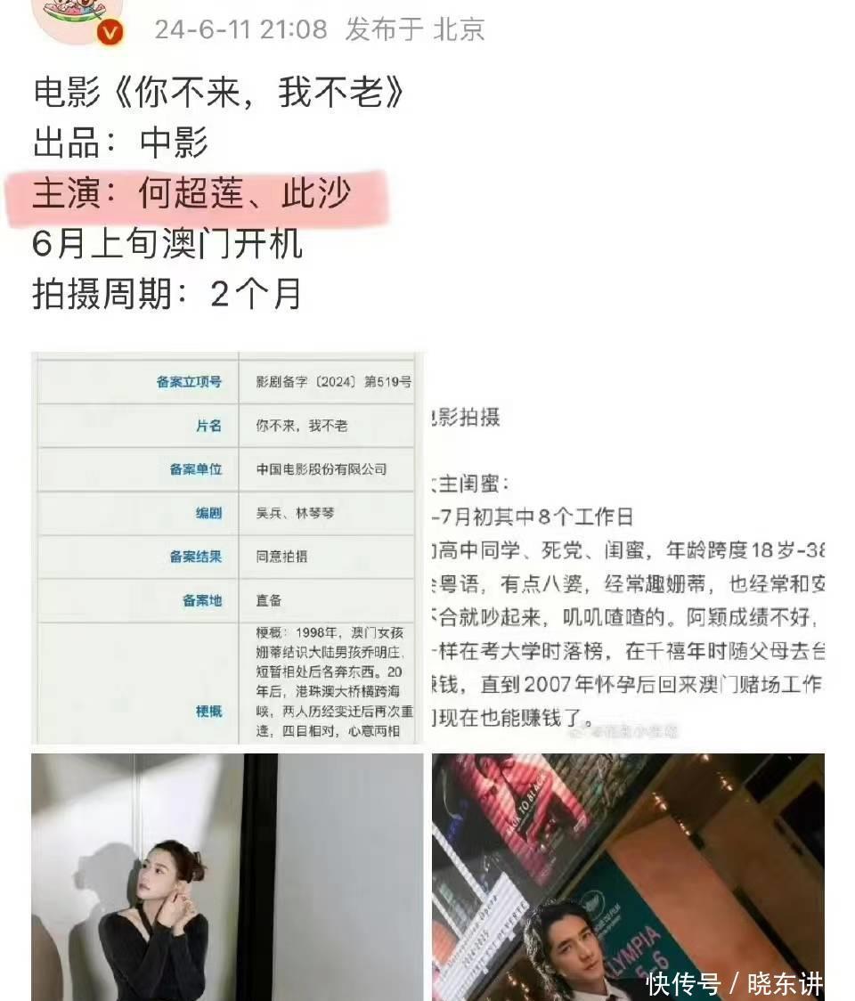 电影已经备案了,叫《你不来,我不老》,应该是爱情片,何超莲和此沙搭档,两人年龄差6岁,何超莲保养很好,毫无违和感。