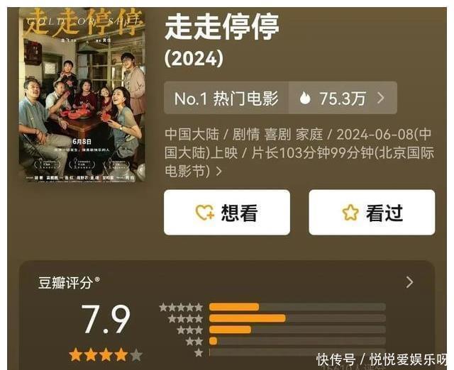 《走走停停》刚刚上映,豆瓣评分就达到了7.9分,非常不错。有15610给出了打分,大多数都给了4星甚至是5星。另外有1.6万人看过,有2.3万人想看。
