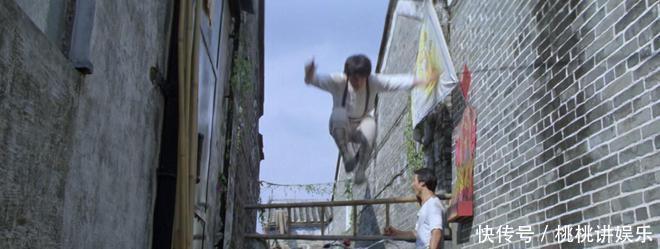 接着一个镜头,就是刚出巷子口,成龙顺手拍了一下门,打开的门板挡倒了后面追来的打手;