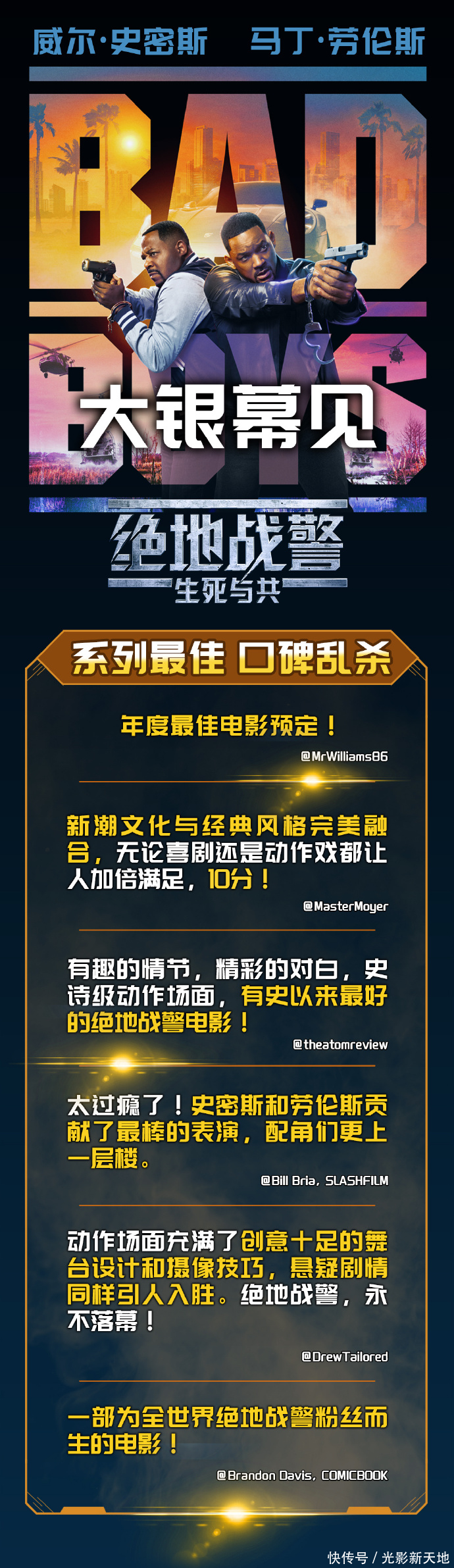 原本就很期待这部电影, “绝地战警”系列跨越近30年,是影响深远的大IP,史皇和马丁这对老搭档一直没拆伙,系列延续至今还能保持“原汁原味”相当不容易,但凡喜欢绝地战警的影迷都不应错过。