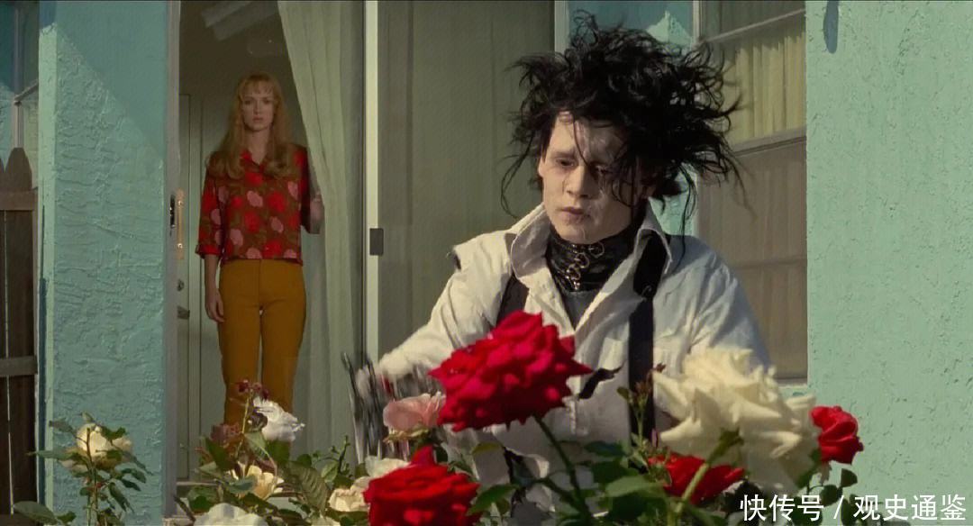 而正是这种异样的造型,使得爱德华成为小镇居民关注的焦点,也让他成为一种特殊的存在。他的剪刀手技艺不仅在艺术创作中表现出独特的美感,也成为了他与世界交流的媒介。这种异样造型带来的身份认同和情感表达,贯穿了整个电影,将爱德华的内心世界与外在形象紧密联系在一起。