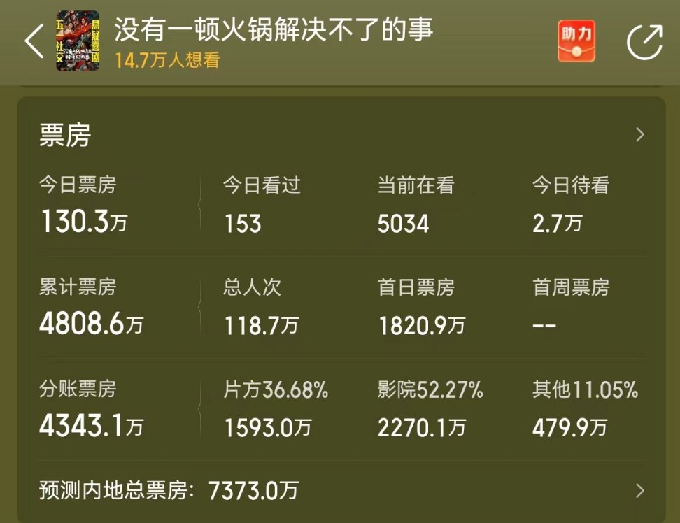 从票房表现来看,《维和防暴队》很快就会被《末路狂花钱》反超,《九龙城寨》靠口碑持续逆跌,最终成绩也不会太差,五部五一档上映的真人电影中,虽然票房垫底的是《穿过月亮的旅行》,但最惨的当属《没有一顿火锅解决不了的事》(以下简称《火锅》),因为制作成本不低,亏损的概率很大。