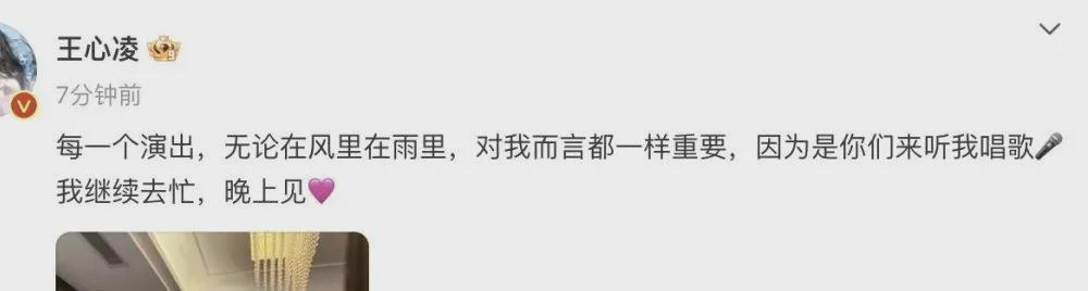 王心凌 回应音乐节只唱了四首就退场:“每一个演出,无论在风里在雨里,对我而言都一样重要,因为是你们来听我唱歌我继续去忙,晚上见”