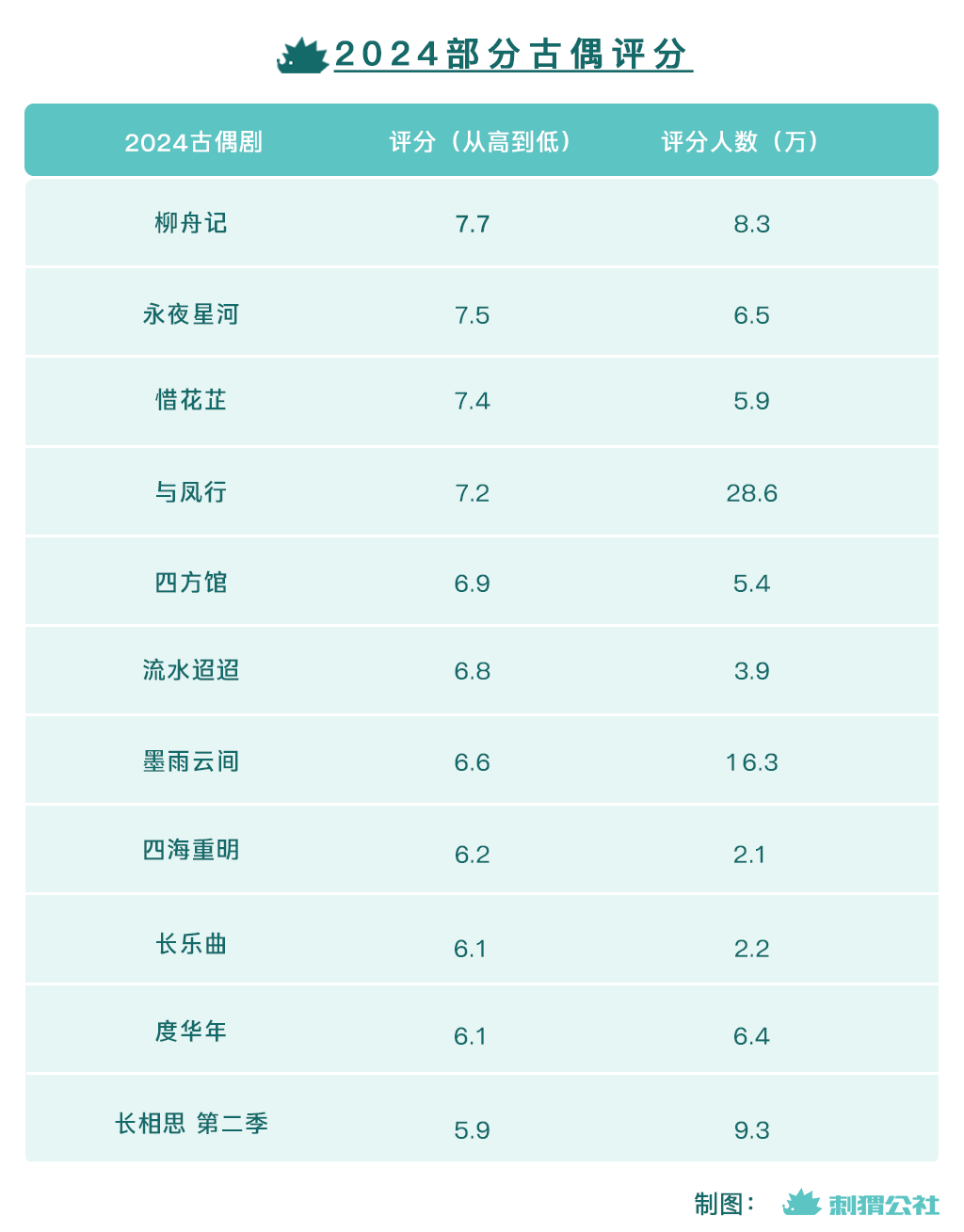 刺猬公社统计了2024年播出的24部古偶剧发现,只有10部剧集豆瓣评分在6分之上,再看评分人数,只有《与凤行》《墨雨云间》《狐妖小红娘·月红篇》的评分人数在10万以上。