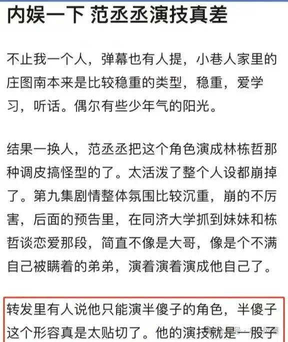 在《小巷人家》中范丞丞的表演被认为非常“出戏”,很难让观众沉浸在剧情中,反而会被他的表现所打断。