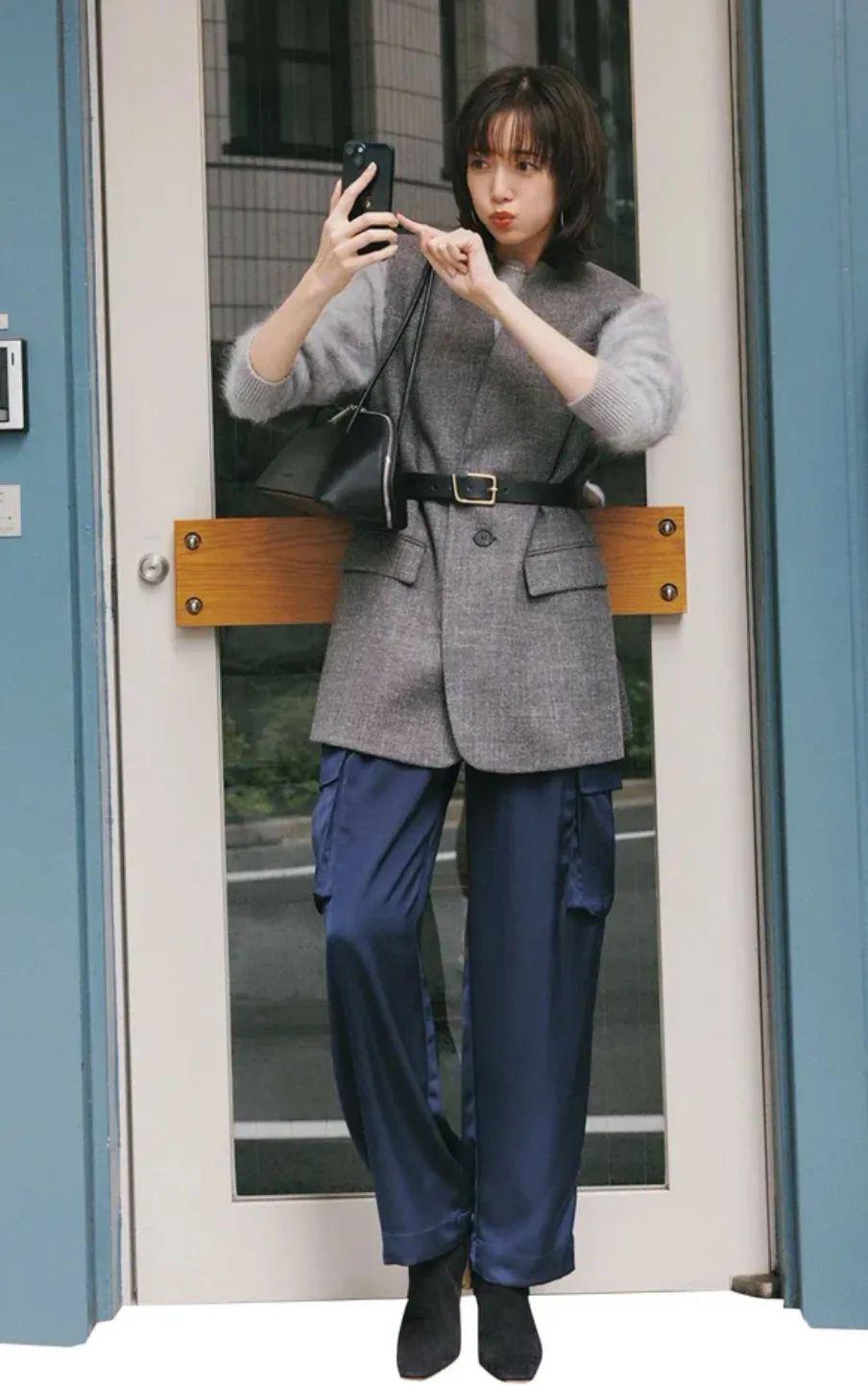 灰色套装在冬天绝对百搭,并且不容易沉闷。尤其这种看上去有雪花感的花色,亮度也比较高,可以提亮肤色。