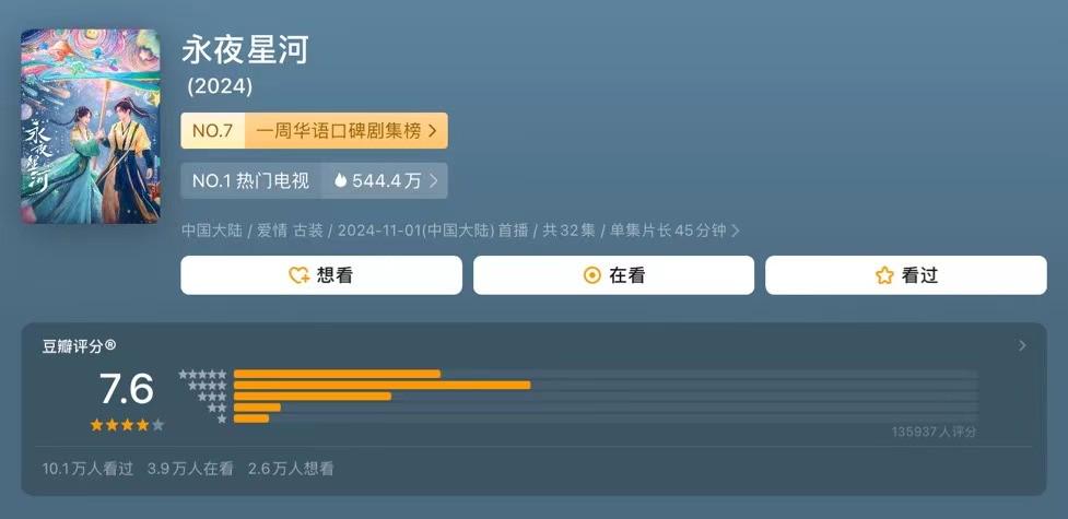最惊艳的就是《永夜星河》了,不仅开分7.6,有望再创古偶剧的口碑记录,在强者环伺的情况下,这部剧甚至还拿下了热度第一。