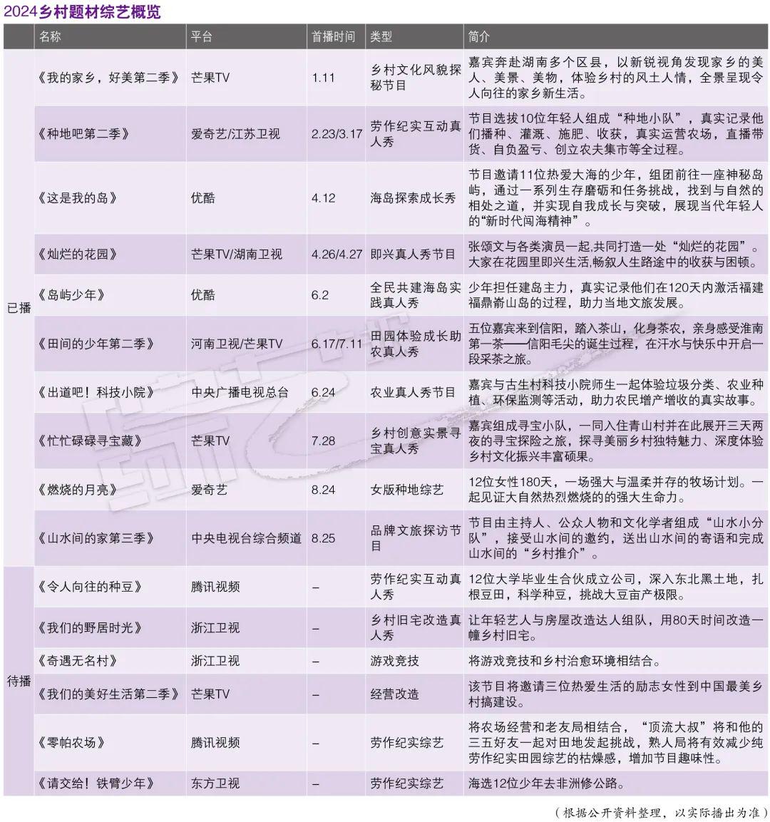 据《综艺报》统计,今年已播乡村题材综艺超过10档,其中综N代占四成,如《我的家乡,好美第二季》《种地吧第二季》《田间的少年第二季》《山水间的家第三季》。这些综艺不断拓展场景,从田地到茶山,从海岛到花园,为观众持续提供新奇体验和治愈氛围。在此基础上,节目深挖社会价值,通过助农直播等方式,完成乡村推介,助力农民增产增收。