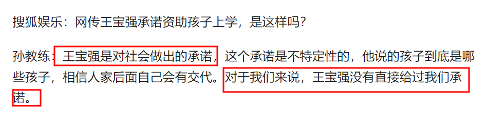 孙教练还说王宝强曾说资助《八角笼中》的小演员,但是没说要资助的是哪些孩子,也没有对他和他带着的4个小演员做出直接的承诺。