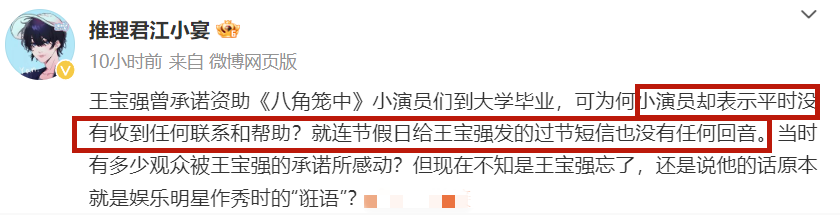 当时,江小宴称王宝强曾承诺资助拍摄《八角笼中》的小演员上学,但没有兑现承诺。