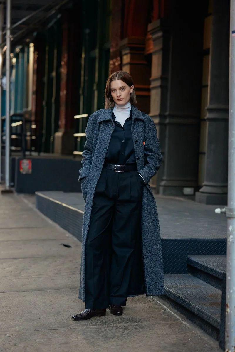 一件裁剪利落的西装内搭高领毛衣,既保暖又丰富了造型。