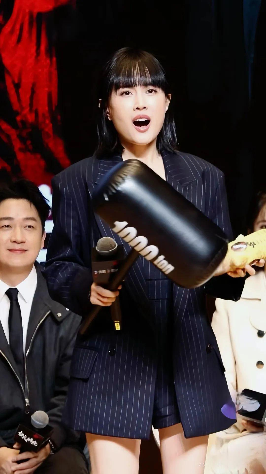 只见台上的尹姝贻穿着一套条纹西装,配一双烟灰色长靴,衬得两条大长腿又细又直,干练优雅中又带点性感,完全看不出她是40岁的人。