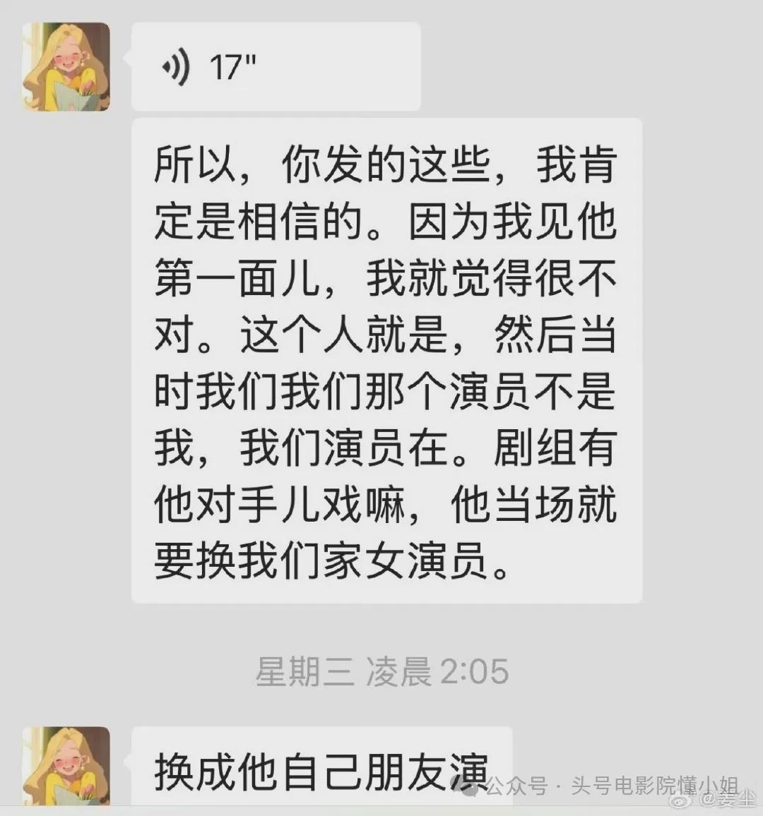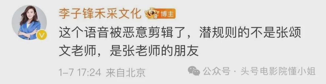 截图显示聊天的对方是影片投资人李某某,这下投资人急了!之后,该投资人在社交账号发声说被偷录和恶意剪辑,表示”潜规则的不是张颂文老师,是张老师的朋友“。