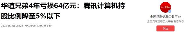 全国党媒信息公共平台:2022-08-06:华谊兄弟4年亏损64亿元:腾讯计算机持股比例降至5%以下