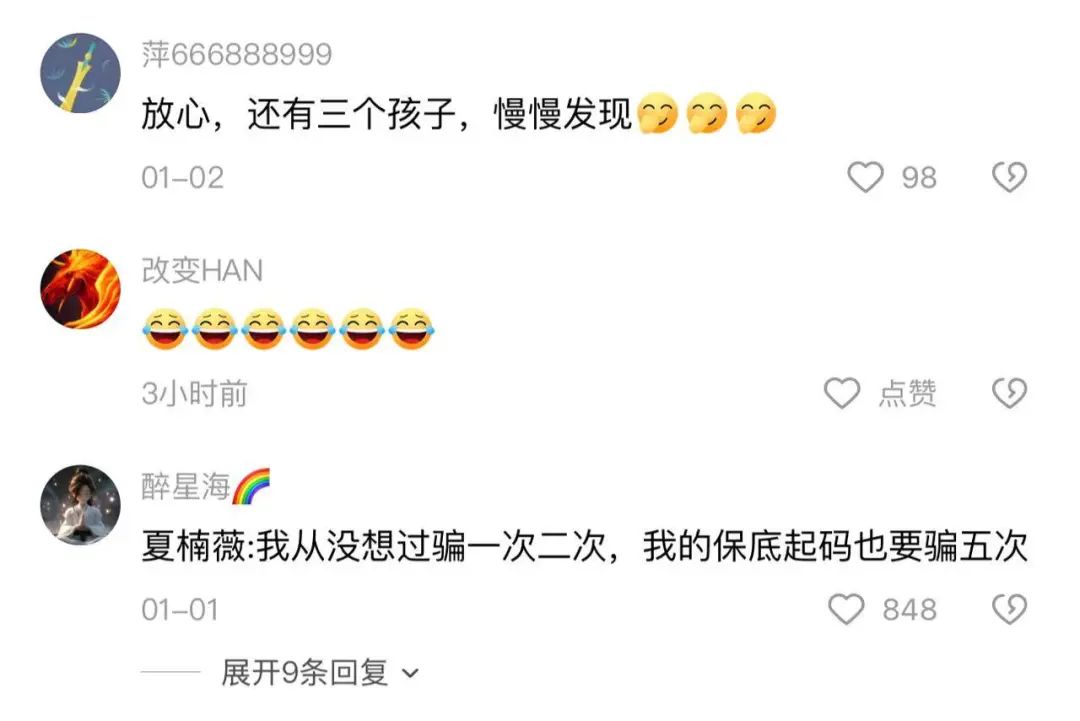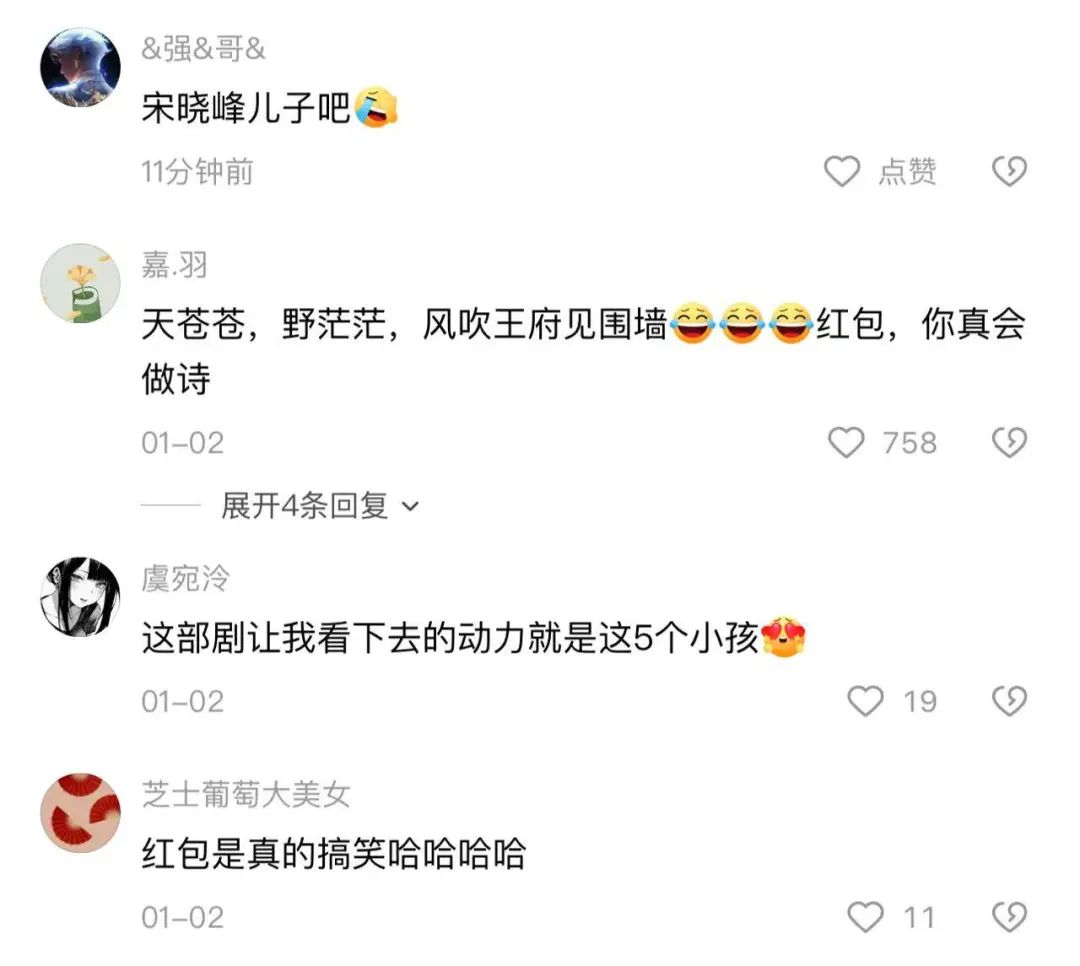 女主的五个孩子分别叫做“恭喜”“发财”“红包”“拿来”和“多多”,和女主的人设极为贴合。除了自恋的老大、冷静的老二、聪明的老四,唯一的妹妹多多和诗人老三更是承包了观众的笑点,也为男女主感情升温进行助攻。妹妹为了王府家产“含泪”同意滴血认亲、给老爹画猫脸帮娘亲报仇,母女俩戏精在身,把摄政王哄得一愣一愣的;诗人老三更是金句频出,一句“此情此景,我只想吟诗一首”贯穿全剧,前言不搭后语的古诗外加李荣浩的歌词,一到关键时刻就出来抖包袱,网友直呼“老三是被宋晓峰附体了”。