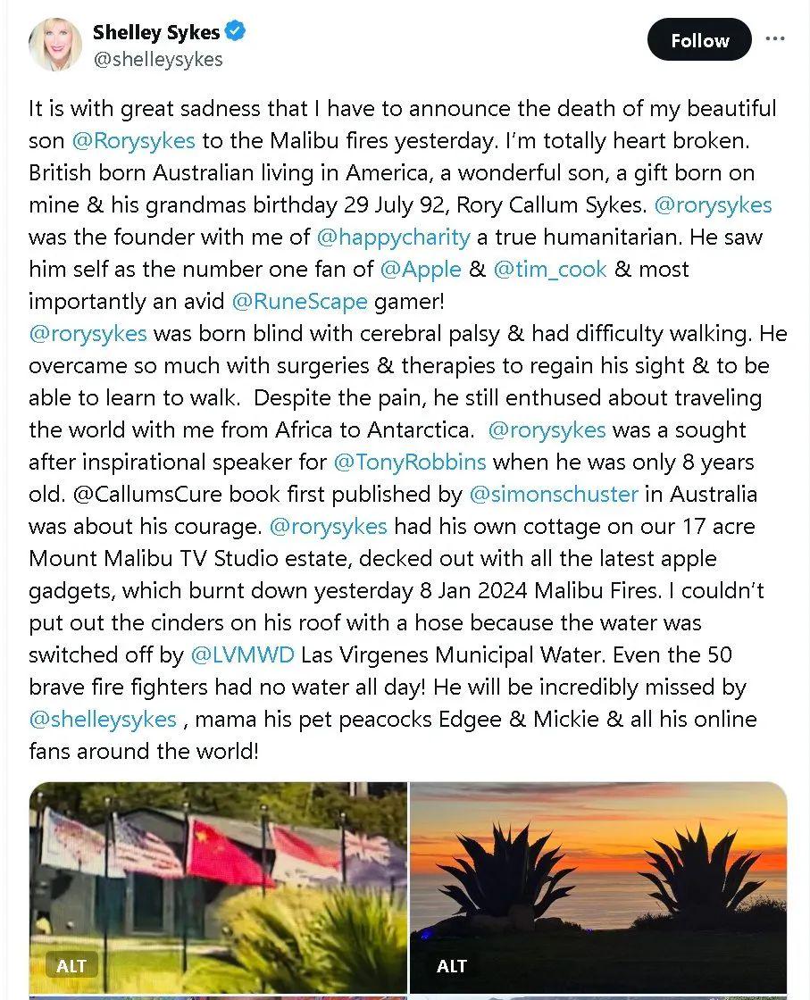 母亲谢莉发文透露澳大利亚前童星、残疾人活励志演说家罗里·赛克斯 (Rory Sykes) 因大火去世,洛杉矶大火烧毁了他们的豪华庄园,罗里最后的话是让母亲不要管他,尽快逃生。谢莉不肯放弃儿子,但因为消防管道没有水,她无法扑灭屋顶的火焰,眼睁睁看着儿子窒息而死。后来消防员告诉谢莉,罗里的死因是一氧化碳中毒。