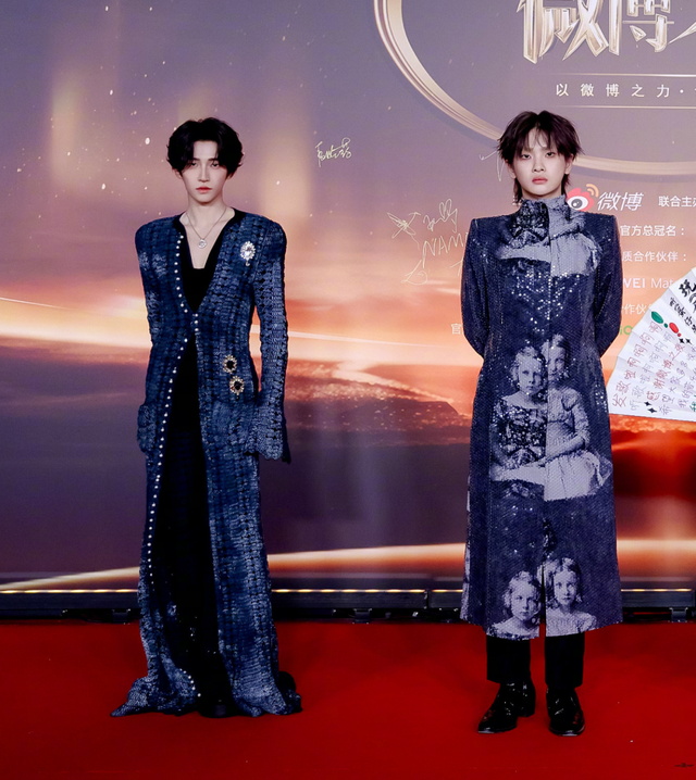 都穿着小蛇修身长袍、底妆都打得忒白、身高也相当,感觉在暗自较劲,但就一整个ctrl c+v,一模一样分不出输赢,怪不得打包一起走。