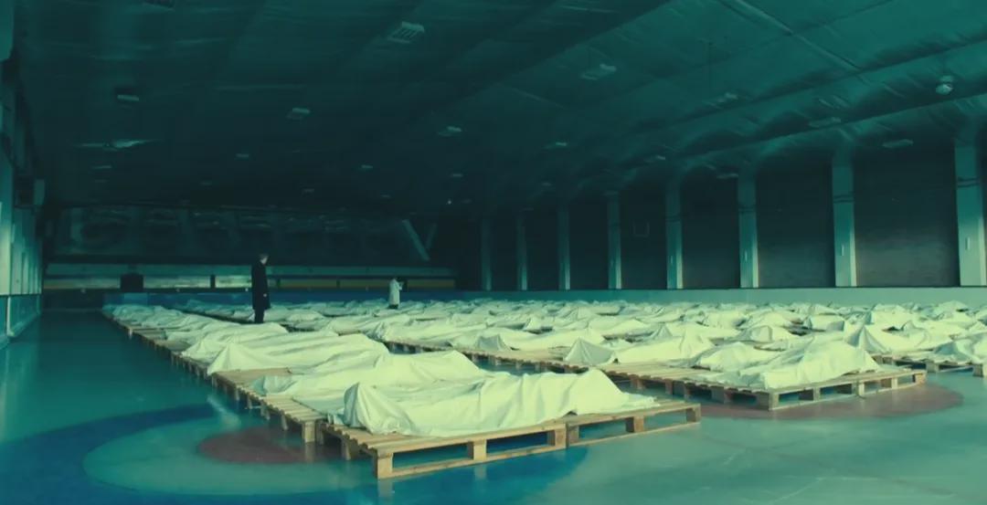 吉姆偷偷潜进遗体存放的溜冰场,尸体盖着白布摆满整个大堂。
