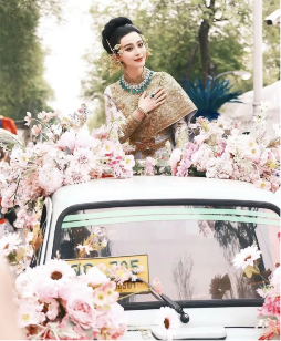4月在泰国参加宋干节,范冰冰盛装出场,在那接近40度的室外,依然面带微笑营业数小时。