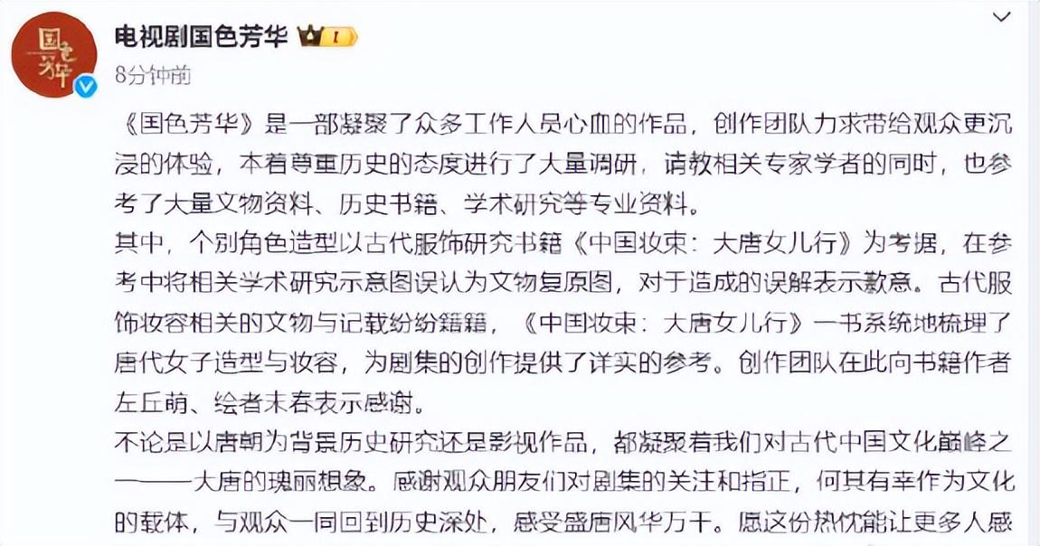 至于妆造就比较尴尬了,《国色芳华》刚播出没几天,就被人投诉抄袭妆造。于是《国色芳华》剧组赶忙公开致歉,表示个别角色造型的确是以《中国妆束:大唐女儿行》为考据,只是“在参考中将相关学术研究示意图误认为文物复原图,对于造成的误解表示歉意”。同时,剧组还向书籍作者左丘萌、绘者末春表示了感谢。