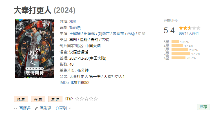 但,截止发稿前,《大奉打更人》的豆瓣评分仍落在5.4分。对比上一部进入腾讯视频「爆款俱乐部」的《九重紫》,也「爆」得不够体面。